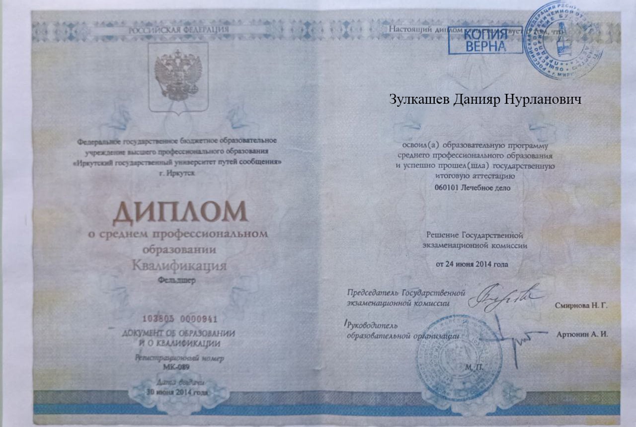 Меня зовут Зулкашев Данияр Нурланович, я — фельдшер выездной наркологической бригады в наркологической клинике "Плюс" в Верее. Я стремлюсь помогать людям, оказывая квалифицированную медицинскую помощь в самых разных ситуациях, и верю, что каждый пациент заслуживает внимания и поддержки на пути к выздоровлению.
